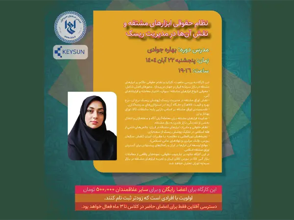 انجمن حسابداران خبره ایران با همکاری شرکت داده پردازی کیسان برگزار می کند: زمان: پنجشنبه ۲۲ آبان ۱۴۰۴ ساعت: ۱۶-۱۹ مدرس: بهاره جوادی این کارگاه به بررسی ماهیت، کارکرد و نظام حقوقی حاکم بر ابزارهای مشتقه در بازار سرمایه ایران و جهان میپردازد. محورهای اصلی شامل:* معرفی انواع ابزارهای مشتقه: سوآپ، اختیار معامله و قراردادهای […]