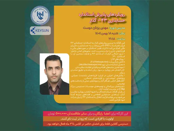 انجمن حسابداران خبره ایران با همکاری شرکت داده پردازی کیسان برگزار می کند: زمان:۱۸ بهمن ۱۴۰۴ ساعت: ۱۸-۲۱ مدرس: مهدی یزدان دوست این کارگاه به بررسی روشهای گذار به استاندارد حسابداری ۴۳ ایران همراستا با IFRS 15میپردازد و به حسابداران و مدیران مالی کمک میکند تا اثرات تغییر استاندارد بر صورتهای مالی و قراردادهای جاری […]
