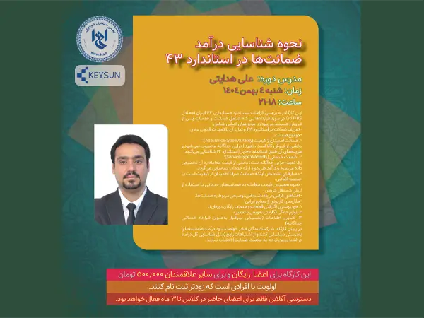 انجمن حسابداران خبره ایران با همکاری شرکت داده پردازی کیسان برگزار می کند: زمان:شنبه ۴ بهمن ۱۴۰۴ ساعت: ۱۸-۲۱ مدرس: علی هدایتی این کارگاه به بررسی الزامات استاندارد حسابداری ۴۳ ایران (معادل IFRS 15) در مورد قراردادهایی که شامل ضمانت و خدمات پس از فروش هستند میپردازد. محورهای اصلی شامل:* تعریف ضمانت در استاندارد ۴۳ […]