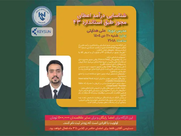 انجمن حسابداران خبره ایران با همکاری شرکت داده پردازی کیسان برگزار می کند: زمان: شنبه ۲۰ دی ۱۴۰۴ ساعت: ۱۸-۲۱ مدرس: علی هدایتی این کارگاه به بررسی نحوه شناسایی و اندازهگیری درآمد ناشی از اعطای مجوزها (Licensing) طبق استاندارد حسابداری شماره ۴۳ ایران میپردازد. محورهای اصلی شامل:* تعریف مجوز در استاندارد ۴۳ و تفاوت آن […]