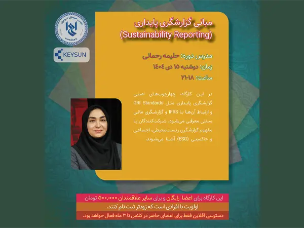 انجمن حسابداران خبره ایران با همکاری شرکت داده پردازی کیسان برگزار می کند: زمان: دوشنبه ۱۵ دی ۱۴۰۴ ساعت: ۱۸-۲۱ مدرس: حلیمه رحمانی در این کارگاه، چارچوبهای اصلی گزارشگری پایداری مثل GRI Standards و ارتباط آنها با IFRS و گزارشگری مالی سنتی معرفی میشود. شرکتکنندگان با مفهوم گزارشگری زیستمحیطی، اجتماعی و حاکمیتی (ESG) آشنا میشوند. […]